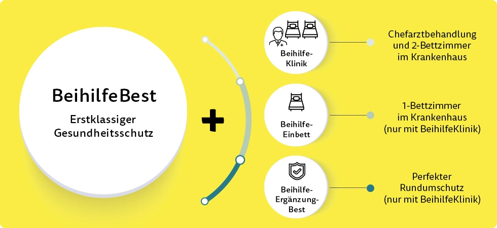 Wenn mit dem Berufsstart schon ein Beihilfe-Anspruch besteht, kommt die Beihilfe für einen Teil der Krankheitskosten auf. Die Absicherung der Restkosten erfolgt über die private Krankenversicherung – mit Leistungen, die während der gesamten Vertragslaufzeit garantiert sind.