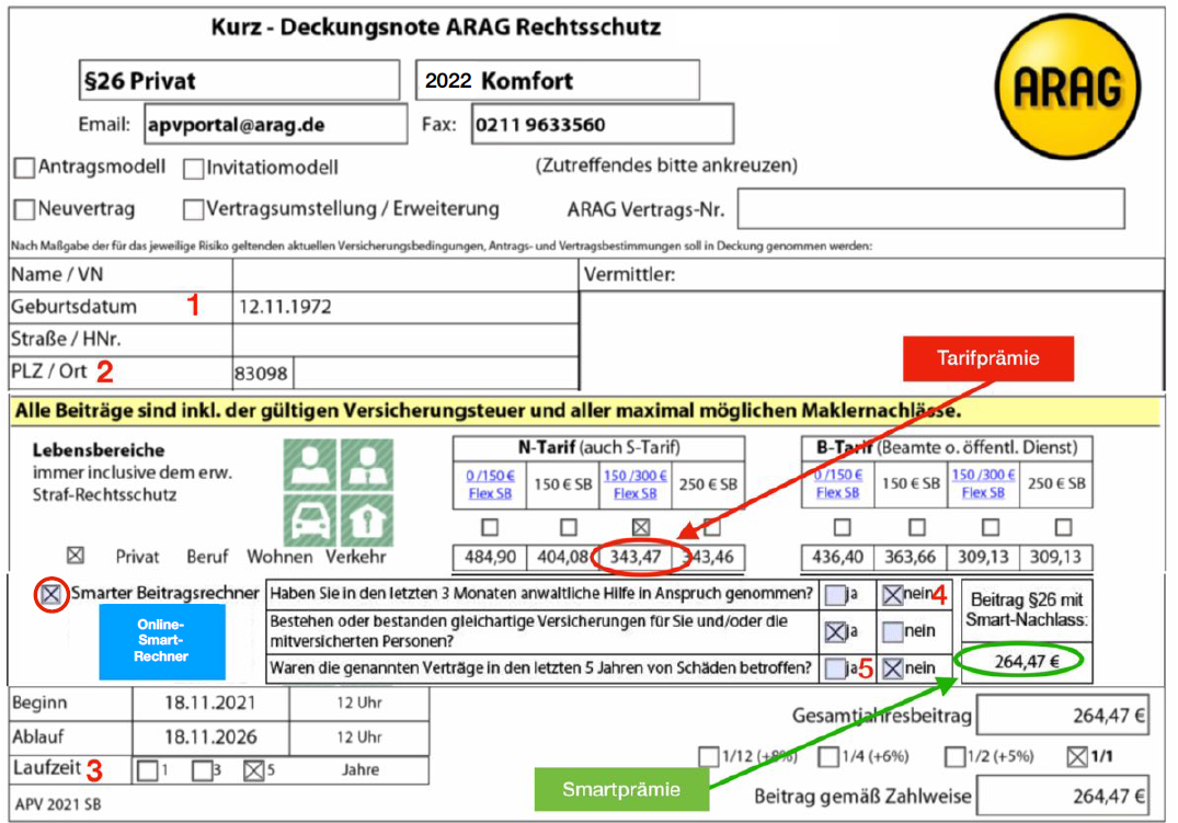 Es ist die Beantwortung aller fünf Fragen zusammen nötig, damit ein smarter Nachlass zum Tragen kommen kann. Die smarte Tarifierung besteht ausschließlich für den Aktiv-Rechtsschutz für Privatpersonen nach §26. Er hat keine Auswirkung auf Annexe oder gebündelte Produkte.