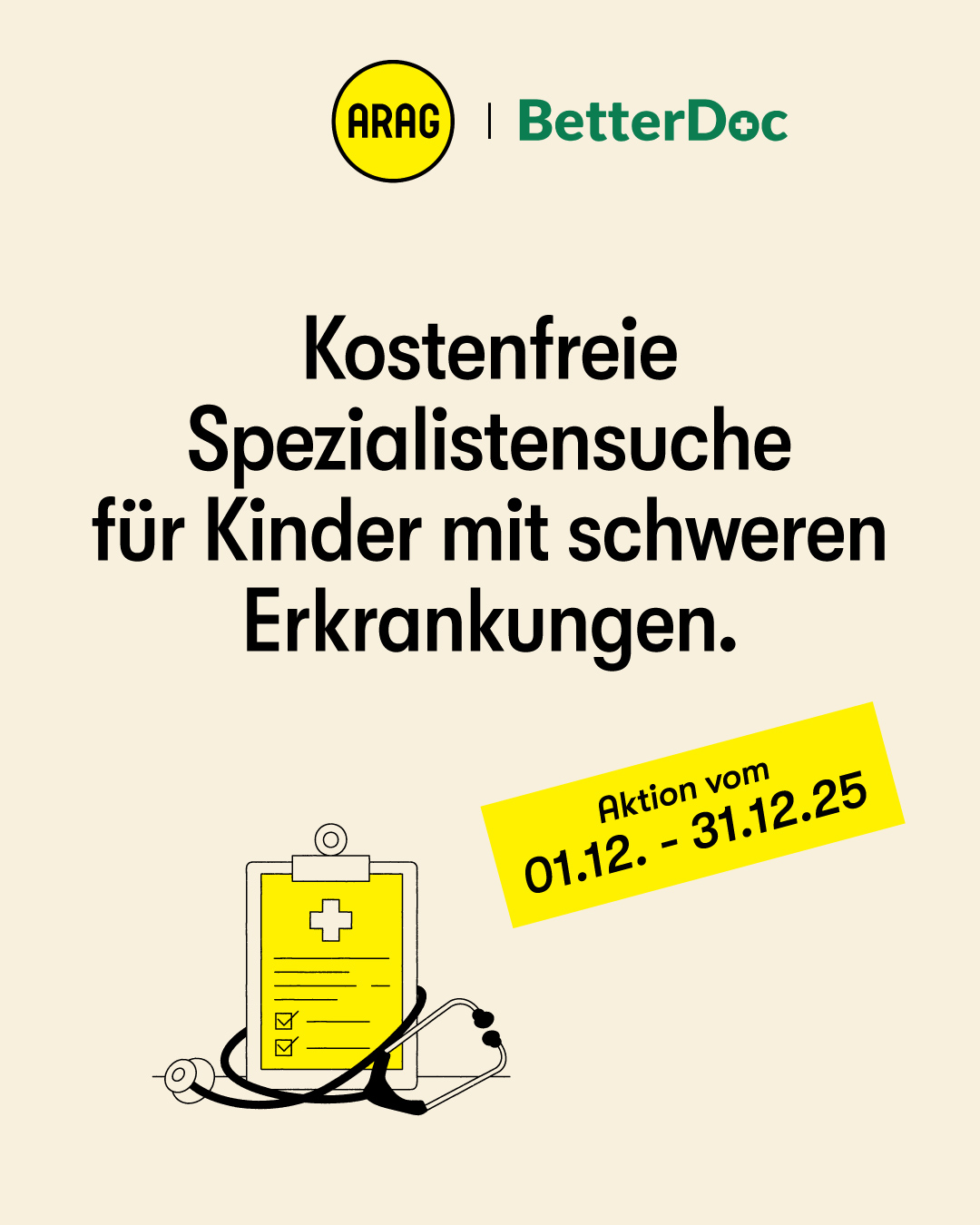 Übrigens: Die Serviceleistungen von BetterDoc können privat Krankenversicherte und Krankenhauszusatzversicherte der ARAG ganzjährig kostenlos in Anspruch nehmen. Weitere Informationen zu den Services finden Sie hier im Netz: