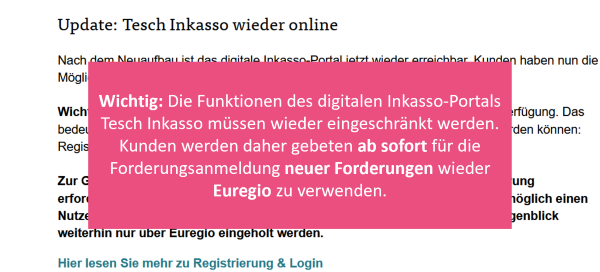 Achtung Korrektur: Update Tesch Inkasso: Leider müssen Forderungsanmeldungen neuer Forderung nun wieder über Euregio abgewickelt werden.